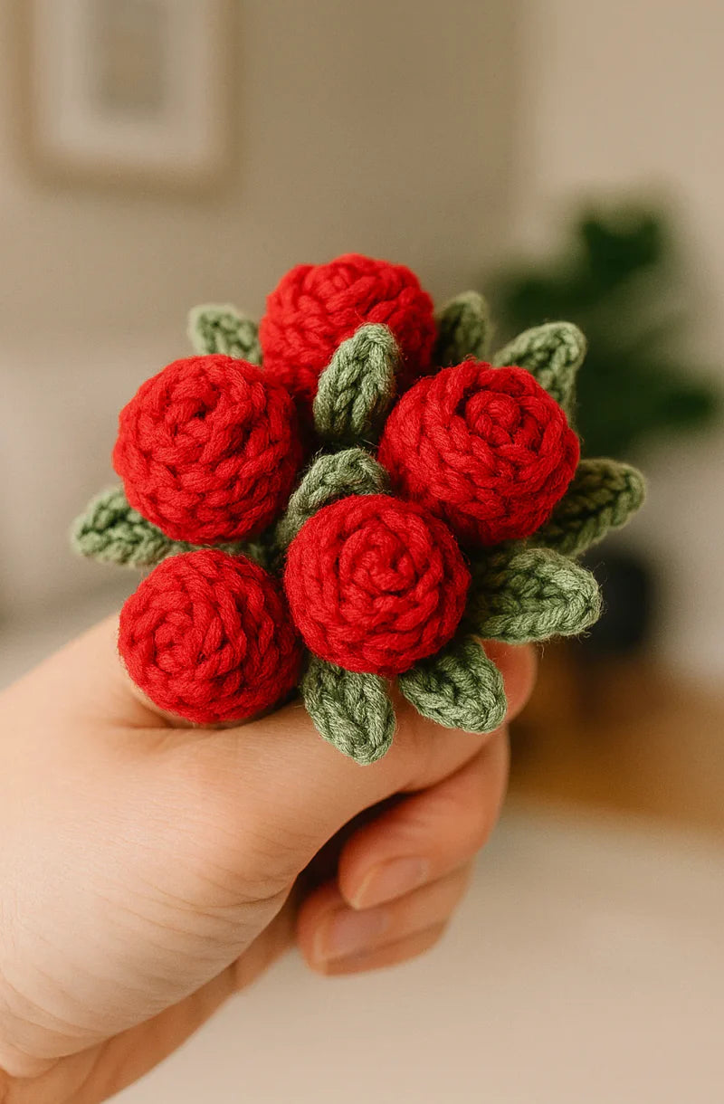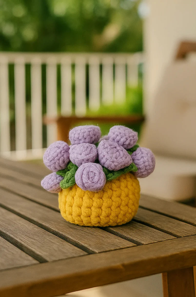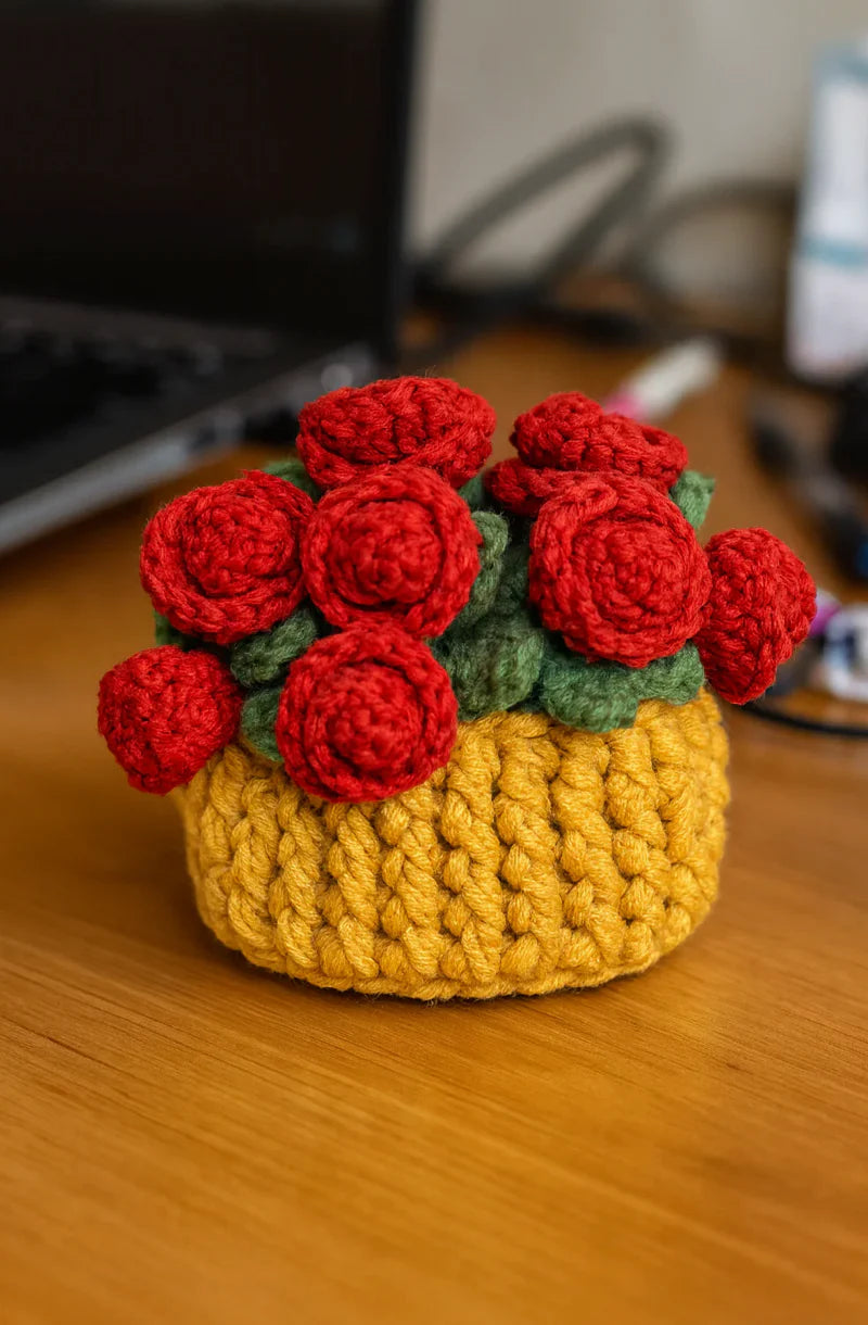 This set includes a beautiful crochet flower coaster adorned with delicately sewn roses, along with a matching crochet planter in a charming basket style. Made with high-quality yarn, each piece highlights the cozy texture and timeless appeal of crochet design