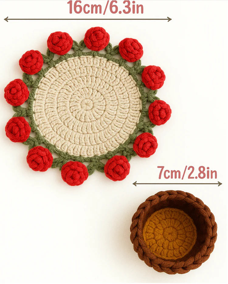 Measuring about16cm / 6.3infor the coaster and7cm / 2.8infor the little basket, these lovely pieces are the sweetest size to brighten up any space. Whether you place the coaster on your desk for your morning coffee, or keep the tiny basket by your nightstand for little treasures, they’re the perfect companions — small enough to fit anywhere, yet big enough to bring a touch of warmth and charm wherever they go. 💛